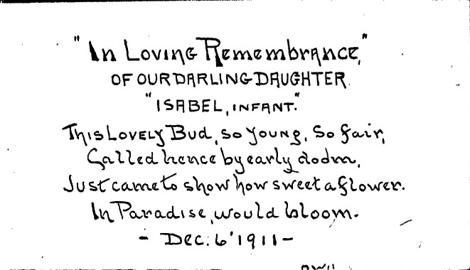 A year and half later Otto and Isabel lost a daughter, Isabel, during childbirth. My grandmother spoke of the loss decades later and my impression is that the loss was preventable by today’s standards. Otto, the strict husband and father, was clearly very moved. This was among his papers.